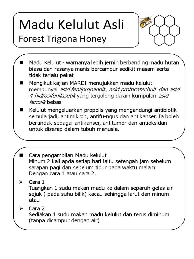 Sunda) untuk 1 sarang, sekaligus. Madu adalah sesuatu yang tidak asing lagi samada di malaysia atau di madu kelulut ialah madu yang dihasilkan oleh lebah kelulut. Anda juga boleh campur madu ke dalam segelas air untuk diminum. Meningkatkan imunitas tubuh terhadap penyakit. Ada berbagai 9 cara paling mudah untuk menguji keaslian madu sehingga bisa terhindar dari dampak madu palsu yang beredar di masyarakat.