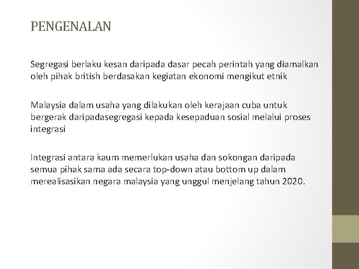Kesan pengamalan dasar `pecah dan perintah' inggeris pada zaman sebelum merdeka.