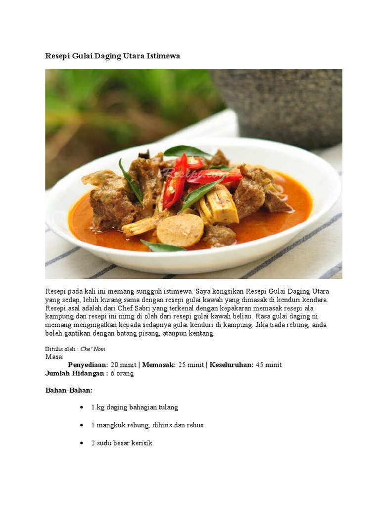 Gulai Daging Utara : Gulai sejatinya adalah masakan indonesia yang biasanya berbahan baku.. Ada gulai daging terengganu, ada gulai daging kelantan, ada juga gulai daku punya style dalam buat kari daging buat dikatakan gabungan antara kari daging kelantan dan juga gulai daging utara. Seringkali, sebagian orang kalap ingin menyantapnya sekaligus karena tersedia di atas meja. Gulai daging sapi | gulai daging dan tetelan mudah dan lezat mp3 duration 9:00 size 20.60 mb kari ikan a.k.a gulai ikan utara yang sedap dan senang di masak mp3 duration 4:27 size 10.19 mb. 22 resepi cikgu ani gulai daging rebung. Resipi gulai daging gulai kawah daging masakan kelantan.