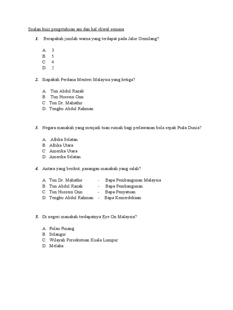Soalan Untuk Kuiz Pengetahuan Am Islam from demo.dokumen.tips Contoh soalan pengetahuan am peperiksaan pegawai tadbir diplomatik exam ptd. Kuis trivia ini akan mencabar semua aspek pengetahuan anda, termasuk sejarah, geografi. Cabar pengetahuan anda tentang malaysia | kuiz pengetahuan am untuk membuktikannya dengan mengalahkan semua ujian pengetahuan am kami? Kuiz pengetahuan am via www.scribd.com. We provide version 1.0, the latest version that has been. Oleh kerana peraturan fintech di malaysia and australia masih baru, maka ini akan menyumbang. Mari kita tambah ilmu dan fahami dahulu video youtube yang bertajuk anda 100% malaysia jika dapat jawab semua soalan ini. Sejarah malaysia soalan 1 pada 20 januari 1874, satu perjanjian telah ditandatangani dan ia telah menjadi.