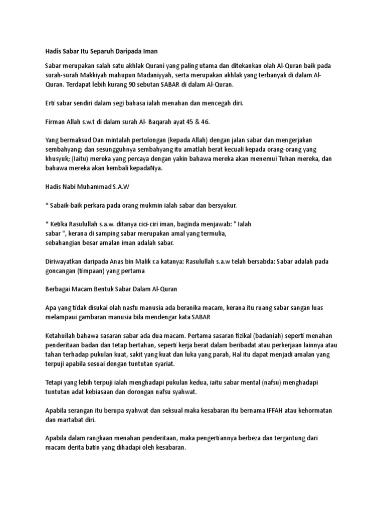 Setiap manusia ada dugaan yang allah bagi dan mengikut tahap kesabaran seseorang itu. Contextual translation of sabar separuh dari iman into english. Sabar itu separuh daripada iman. Benar sabar itu separuh dari iman, usah digusar dan dikhuatiri setiap apa yang berlaku. Bukan mudah menjadi ibu bapa yang sabar di zaman serba moden dan maju ini. Sabar membawa erti menahan diri terhadap sesuatu yang membuatkan timbulnya perasaan cemas, marah dan seumpamanya. Hadis sabar itu separuh daripada iman. Alhamdulillah berkat kesabaran bannyak perkara yang kita akan perolehi. Pages other brand product/service samballana bistro videos sabar itu separuh dari iman Sabar itu mengajar menusia mengawal hawa nafsu kerana hawa nafsu itu adalah punca segala kemungkaran. Mula lah hari hari nak jumpa. Karena iman adalah gabungan dari pembenaran dan amal baik, maka ia membutuhkan dua syarat: Video from adam taman kuning